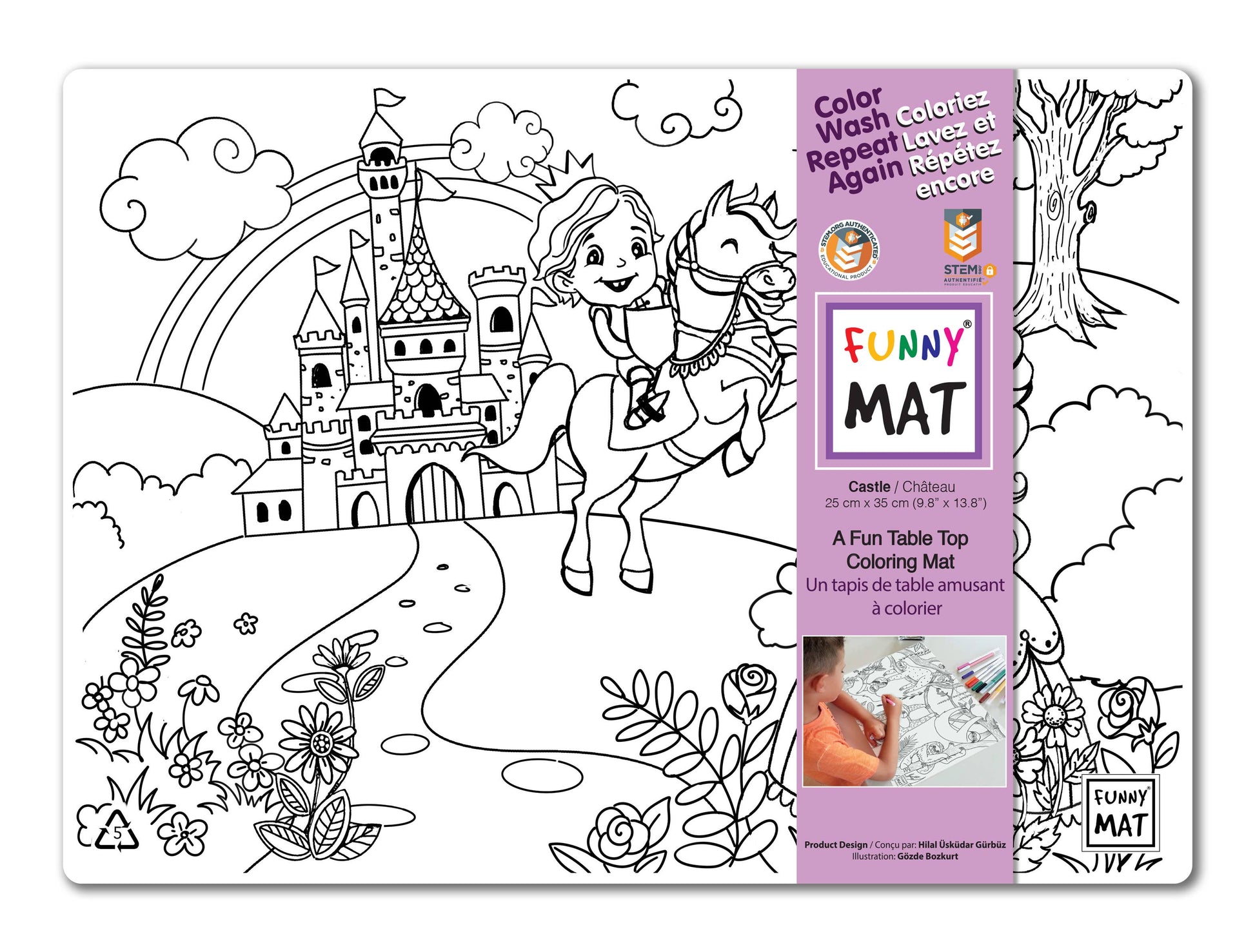 Funny Mat is a table top cover that can be used for craft projects such as drawing, coloring or as a protective mat for painting, plasticine and play dough or as a placemat. The designs on Funny Mat can be colored with water-based, washable markers. Funny Mat is made of polyproylene and is recyclable and reusable.