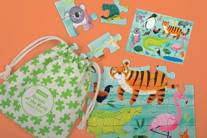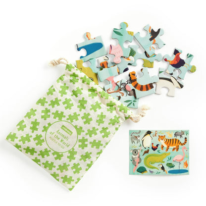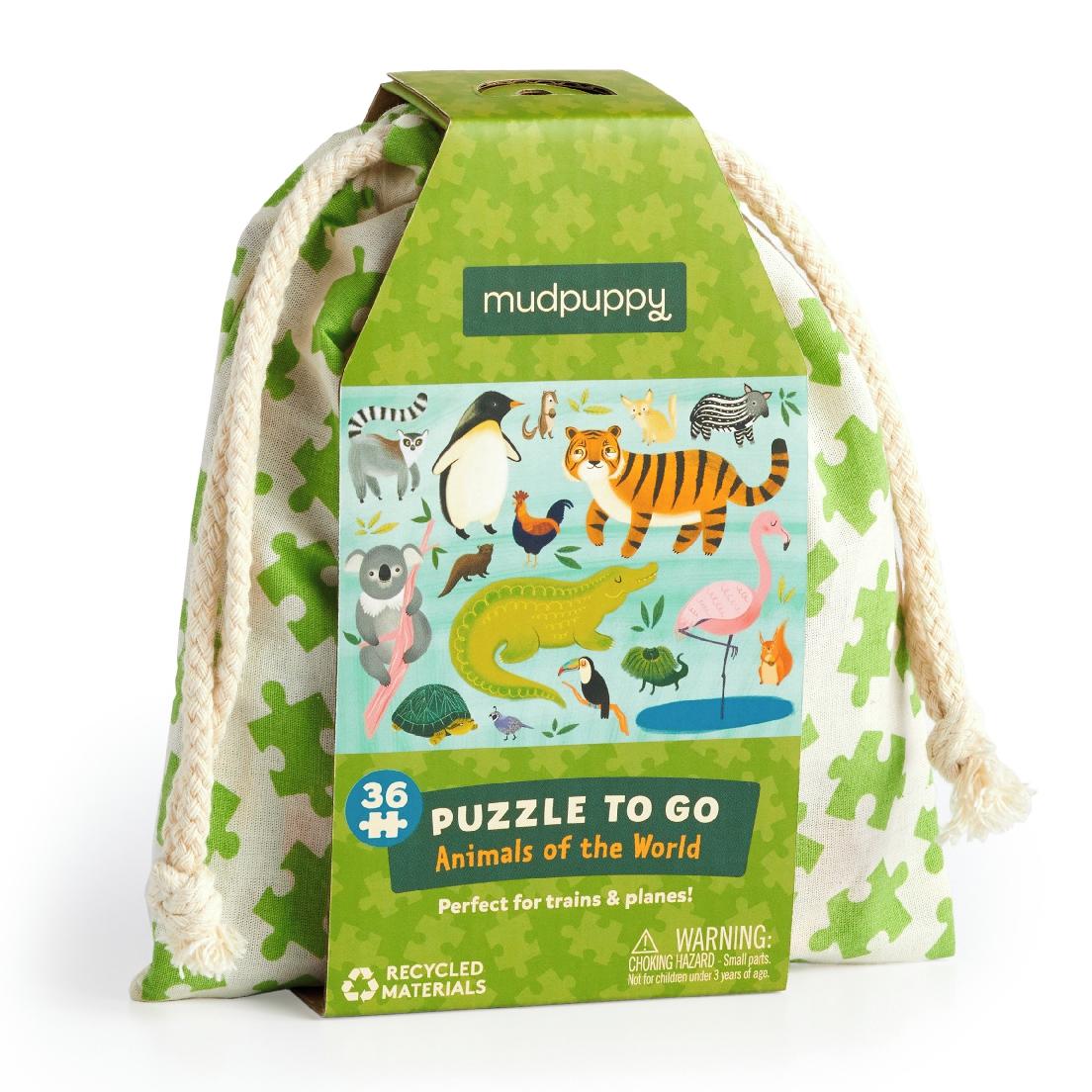 Puzzling on the move has never been easier with Mudpuppy's Animals of the World Puzzle To Go. Packaged in a travel-friendly drawstring pouch, this puzzle features illustrations of exotic animals from around the world. - 36 pieces, 12 x 9"
