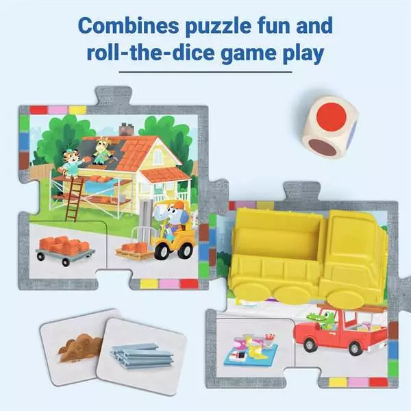 Your toddler will build fine motor skills, color matching, direction following, turn taking, and decision making with Bit City Builders! Pick up materials from construction sites, roll the die and move your truck to the matching road, and deliver materials to the right site to collect stars.
