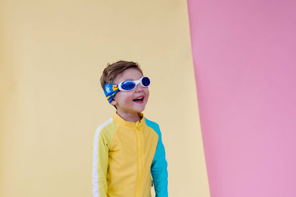Our Boo swim goggle features our tangle-free strap in colorful monster print on a blue background paired with white frames and lightly tinted blue lenses.