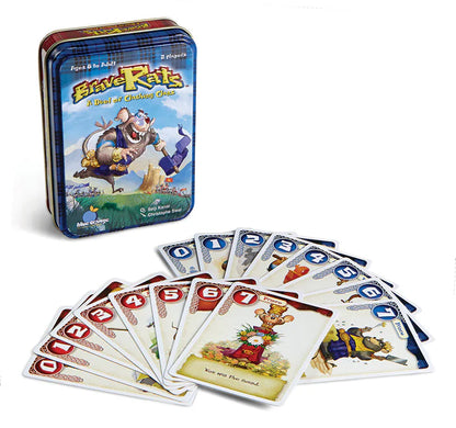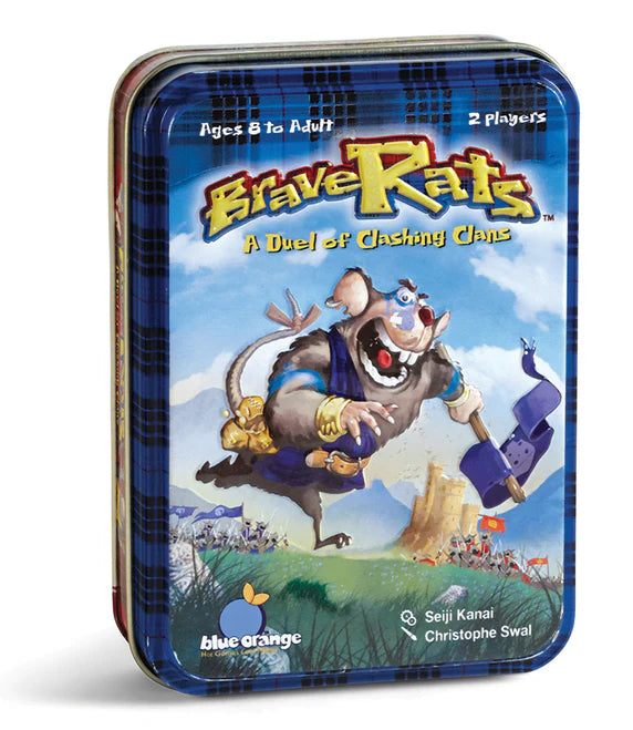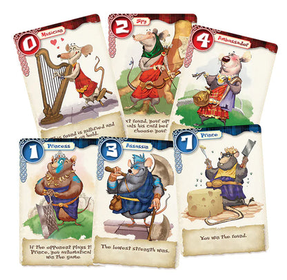 In the Highlands of Medieval Scotland, an epic battle is taking place underfoot! Rivaling rat clans clash in a bid for the throne in this two player strategy game. Both players have a hand of eight cards numbered 0 to 7, with each character on the card possessing a special power. Cards are revealed in a calculated duel with the victory going to the higher number, unless the special power overrules. The first player to win four rounds claims the kingdom for their clan.