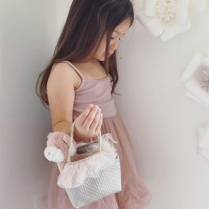 Tote around your pet bestie in their very own pretty toy purse! A mini sized Callie the kitty in a beautiful novels satin bag, trimmed in soft pink tulle and gold handle.