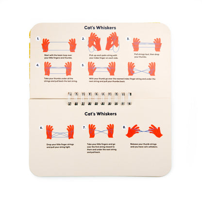 Kidoki Cat’s Cradle is a take on the traditional hand game played by children for generations. Wire-bound cat faced books with string to create various cats cradles, such as Cup and Saucer, Jet Plane, Star, Cats Whiskers, and Witches Broom.