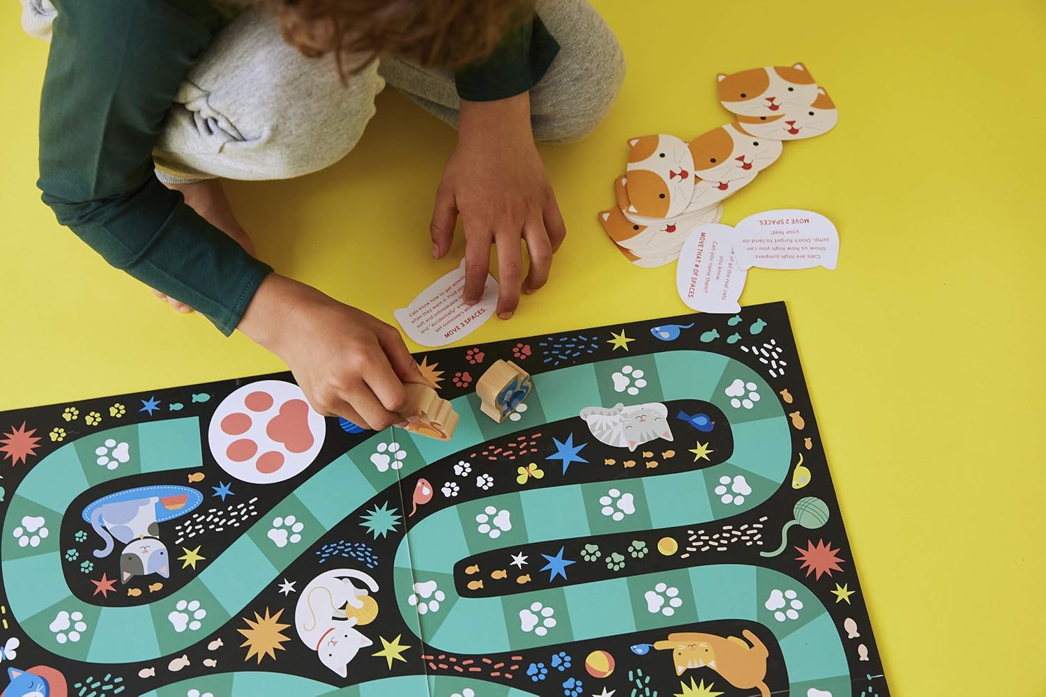- Includes 1 game board, 4 wooden cat characters, 1 die and 51 action cards in English, Spanish, and French