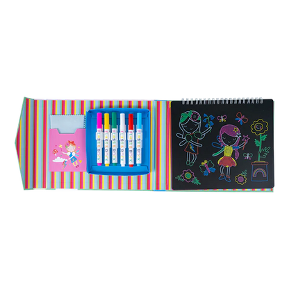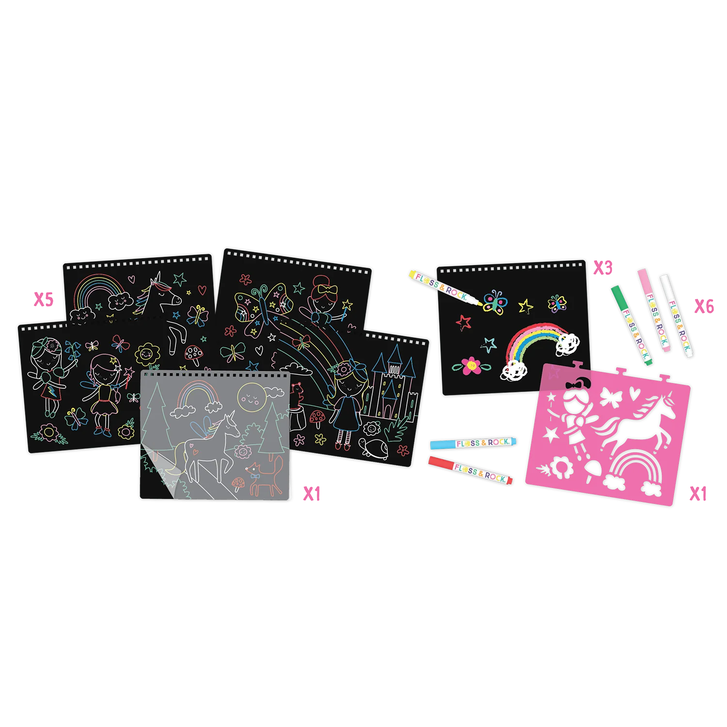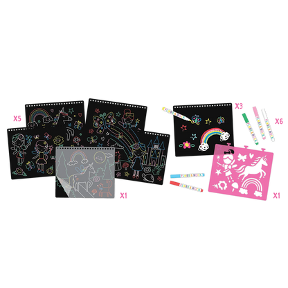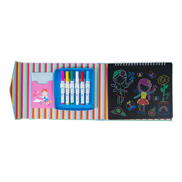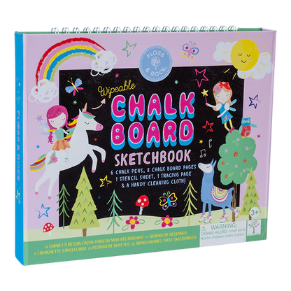 Chalk board fun in a wipeable sketchbook format! This brilliant Rainbow Fairy Chalk Board Sketchbook contains 8 pages. 5 pages with ready to colour-in illustrations featuring rainbows, fairies, unicorns and more, plus 3 plain pages ready for freestyle doodling! There's also a tracing sheet and a super, Rainbow Fairy themed stencil sheet. Both these sheets can be removed and clipped into the spiral book bind where ever you choose! The sketchbook comes with 6 coloured chalk pens and a handy cleaning cloth to wipe the pages clean when you're finished, ready to start again and continue with your creativity next time! The pages are printed with vegetable inks and all of the paper, card, plastic and metal contents are recyclable.