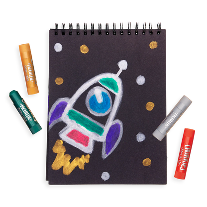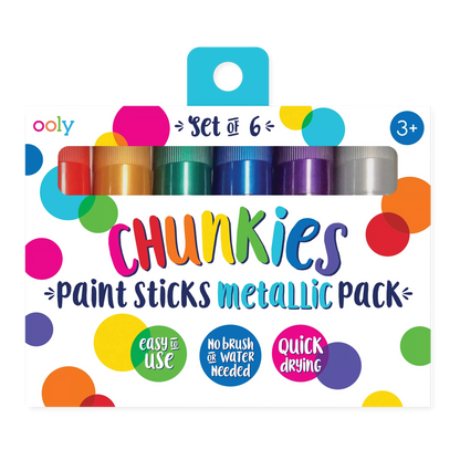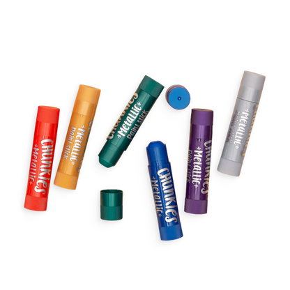 Bring on the sparkle with Chunkies Metallic Paint Sticks in a travel-friendly pack of 6! These lustrous metallic paint sticks are easy to hold and come in 6 satiny metallic quick drying colors. You twist up the barrels for long-lasting, mess-free fun that kids and adults alike will love. When you want to paint colorful pictures but want to leave the mess behind then it's time to reach for Chunkies Metallic Paint Sticks. Chunkies are super easy to use, clean and portable because they're like painting with a crayon. Just uncap, twist and start painting. Chunkies metallics are a set of 6 glowy colored paint sticks housed in a thick barreled casing so they're easy for little hands to hold. The paint colors are quick drying and won't smudge, but it's easy to mix colors to make even more colors. It's magic!
