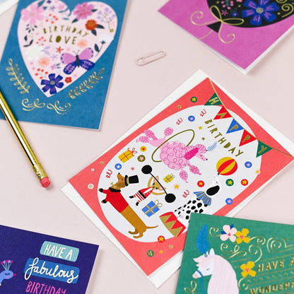 This kids birthday card features a bright and fun design featuring different dogs performing circus tricks. From a strongman chihuahua to a ringmaster dachshund, the perfect birthday card to send your favourite dog fan! This gender-neutral birthday card design is for children of all ages, complete with a little luxury in its gold foil finish.