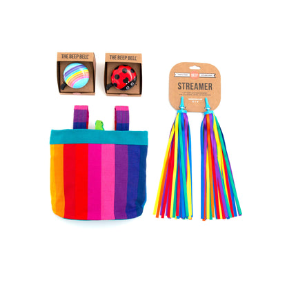 Level up or personalise a bike, trike, or scooter with our Australian-designed Classic Rainbow Streamers. While considered ‘old-school’, streamers just never go out of style and these retro-style tassels have bright yellow, orange, red, green, purple and blue colours that look so fun blowing in the wind! Easily installed into the handlebar grip of your bike, trike or scooter, the Classic Rainbow streamers make a memorable gift for any kid on the go! Each Beep Streamer pair comes with our Beep swing tag.