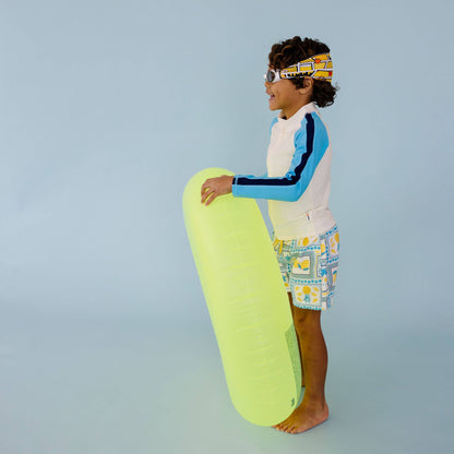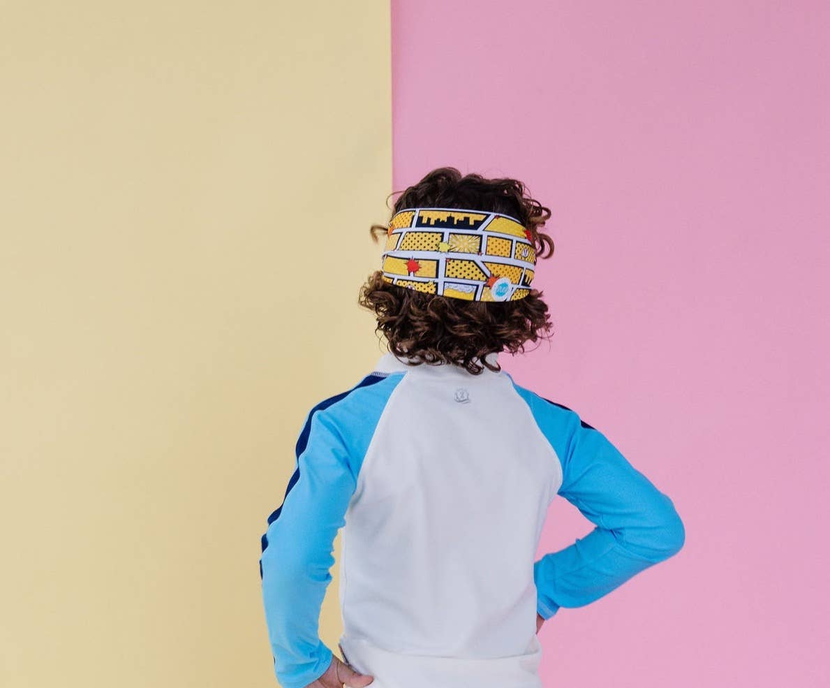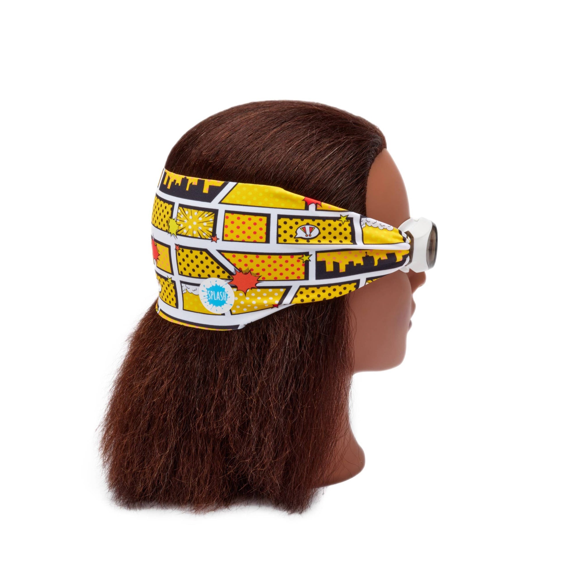 Our Comics swim goggle features our tangle-free strap in a bright yellow with black and white comic art print. Paired with a white frame and clear lenses.