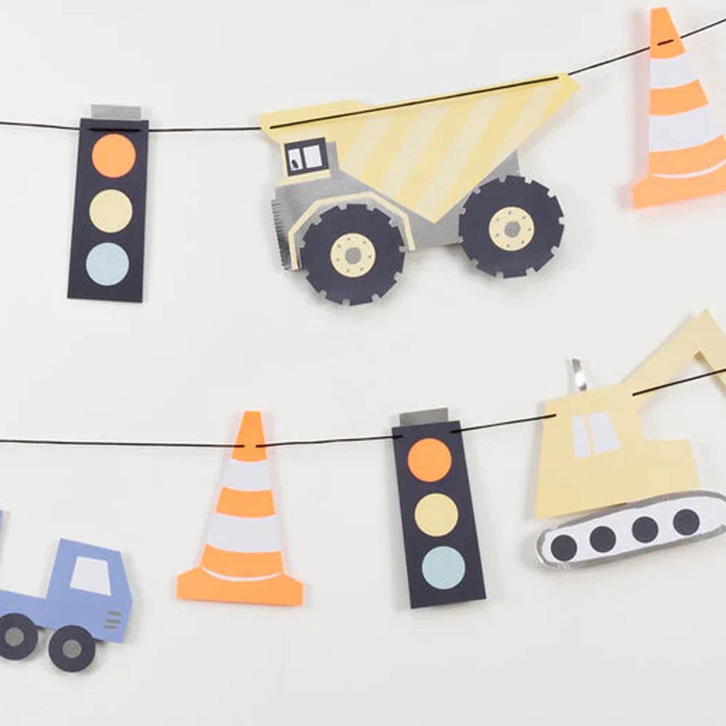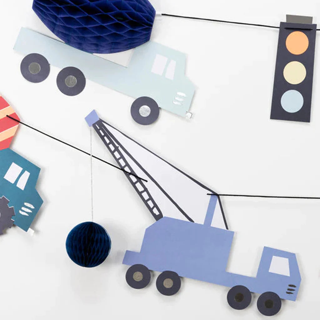 Turn the party room, or a bedroom, into a fabulous construction zone with this colorful garland. It features beautifully illustrated vehicles, with 3D honeycomb paper effects and eye-catching shiny silver foil details.