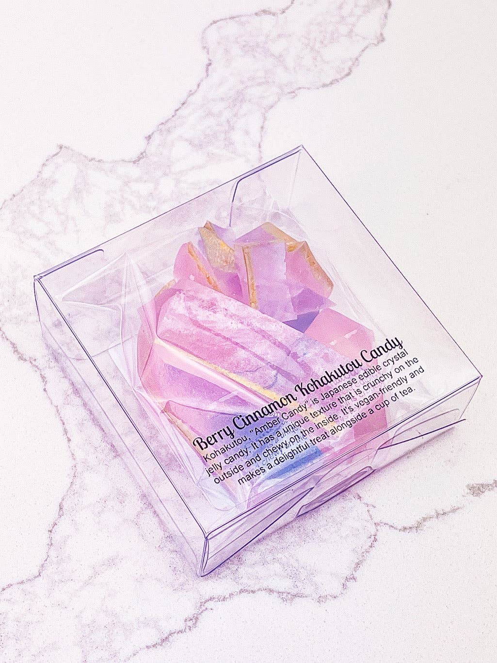 Kohakutou, "Amber Candy" is Japanese edible crystal jelly candy. It has a unique texture that is crunchy on the outside and chewy on the inside. It's vegan-friendly and made of agar agar instead of gelatine. It makes a delightful treat alongside a cup of tea. The Berry Rose flavoured Kohakutou package contains 5-7 pieces/55g of Kohakutou. Our beautiful packaging is gift-ready and perfect for party favours, stocking stuffers or corporate gifts. The candy is sealed in a cellophane bag and placed in a clear 3 x 3 x 1-inch box. *Colour and designs may vary. Shelf-life 8 months.