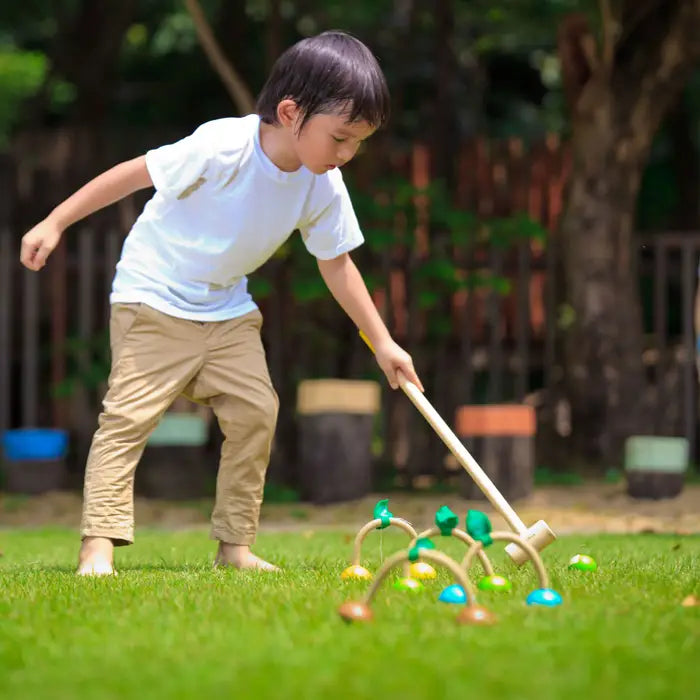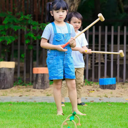A favorite family game with a very friendly design. The colorful Croquet set can be played indoor and outdoor. The set includes 4 different animal wooden balls: bird, tiger, monkey and frog, 2 mallets, 4 wickets, and a final stand. Bag included.