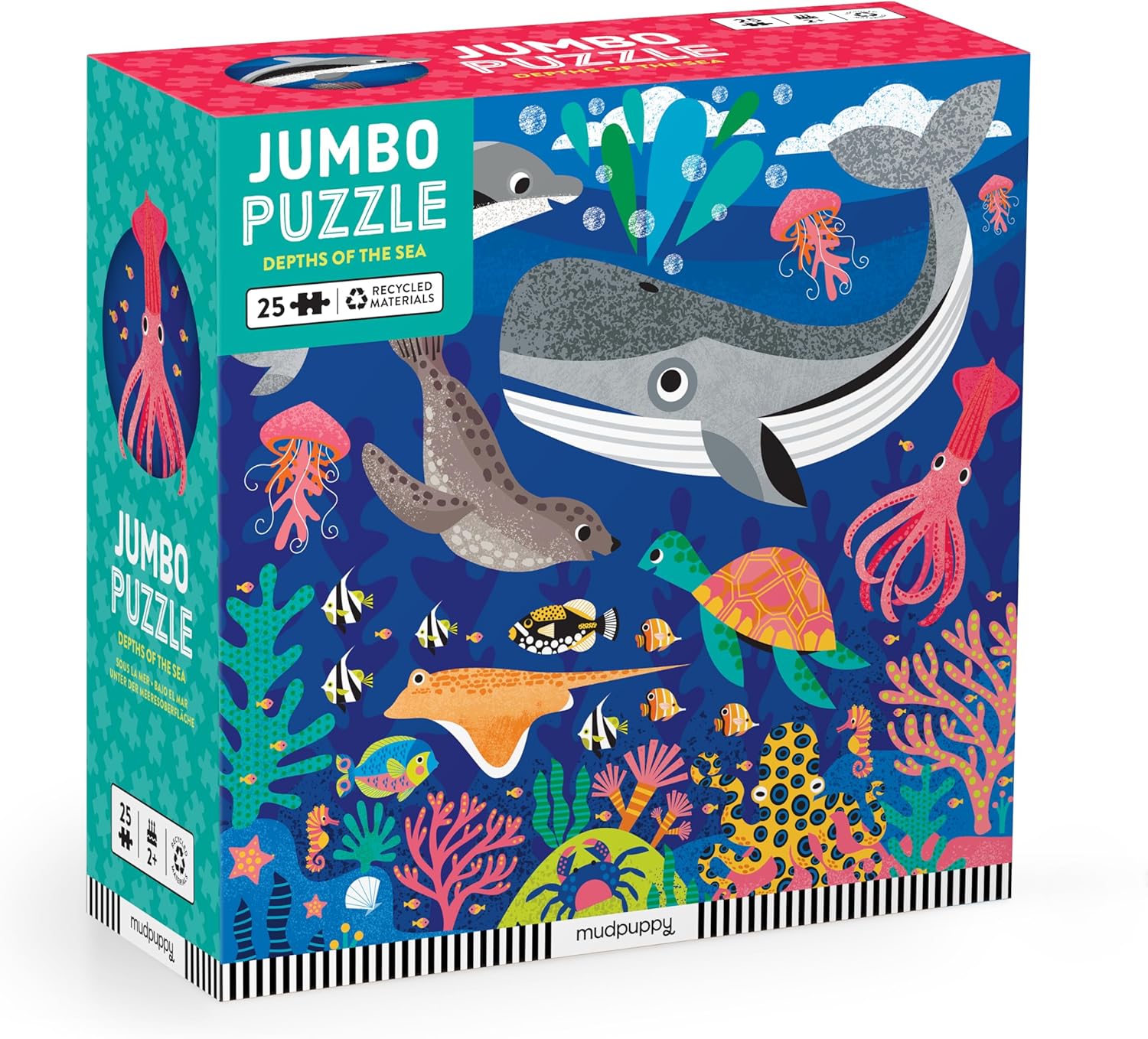 Piece together a colorful underwater scene with Mudpuppy's Depths of the Sea Jumbo Puzzle. A stingray, seahorse, and jellyfish are just a few of the delightful critters you'll find as you assemble the 25 oversized and durable puzzle pieces. Jumbo Puzzles are a fun and educational way for the youngest puzzlers to practice hand-eye coordination and problem solving.