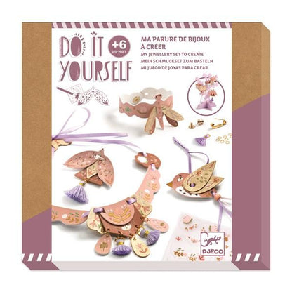 A creative kit to make an elegant, synthetic-leather jewellery set including a necklace, bracelet, brooch and hair accessory. Using a pencil, rub over the decals to transfer them onto the leather pieces following the suggested templates. Then, assemble each charm using the ribbons, elastic and clasp, and enhance them with tassels. The result is a delicate jewellery set. All you need to do now is wear them! When it’s time for bed, you can hang them on the jewellery holder until the next day!