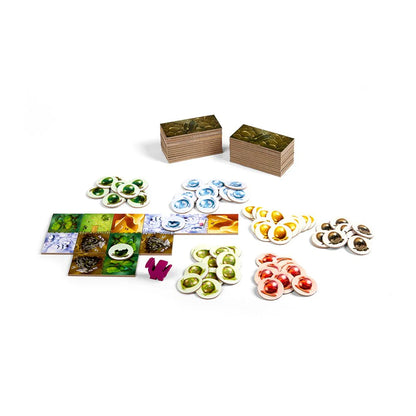 Includes 28 exploration dominoes, 69 Egg Tokens, 1 Mommy Dragon meeple, 4 Starting Dominoes, Illustrated Rules
