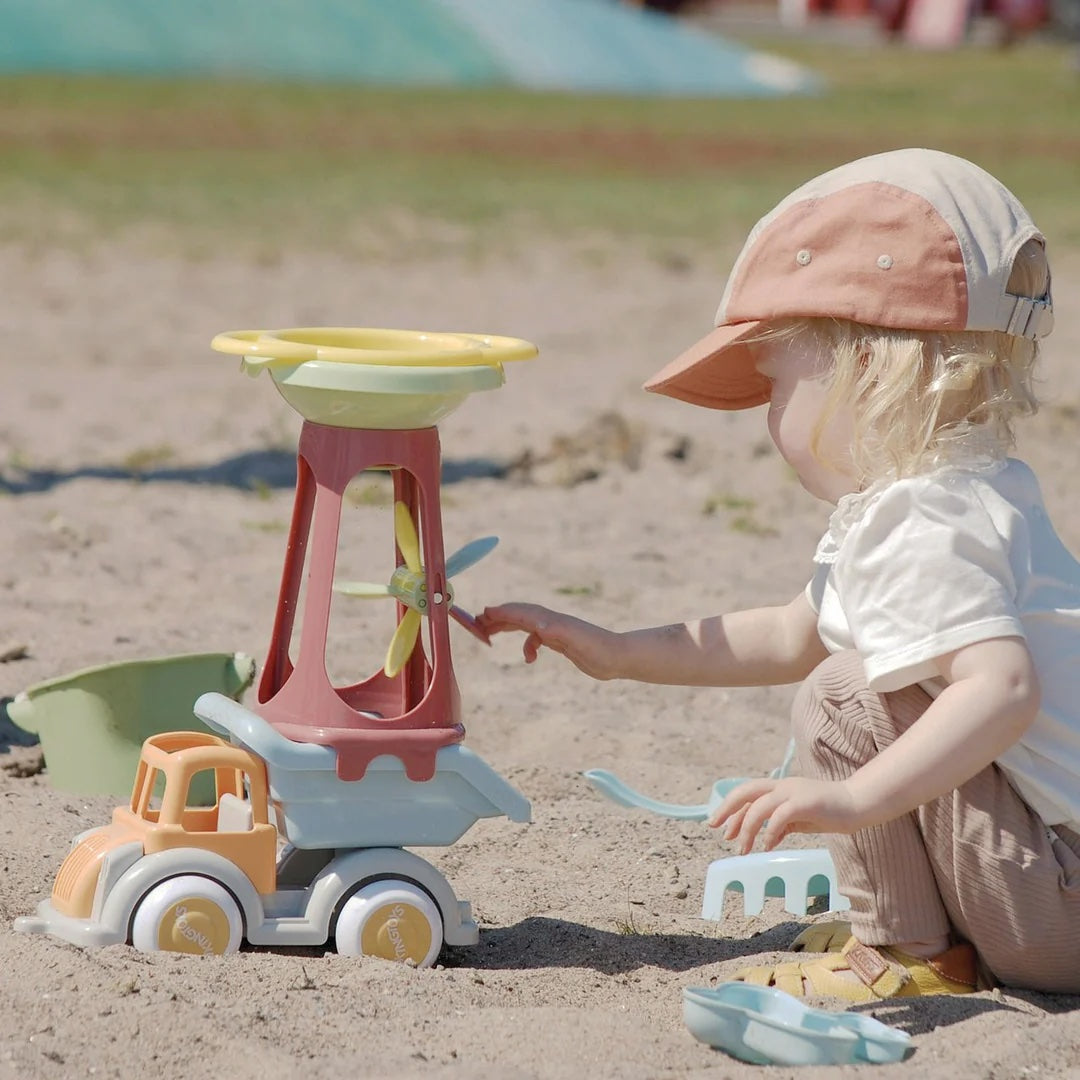 The beach construction is in full swing. The paddle wheel goes round and round. ”Vroom vroom”, says the truck waiting for the next load of sand. Only first class building material with Viking Toys’ sand and water mill.