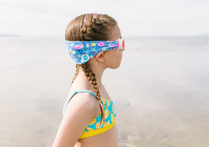 Our Flamingo Pop goggle features our tangle-free strap in a bright a summer flamingo print, paired with a white frame and lightly tinted pink lenses.