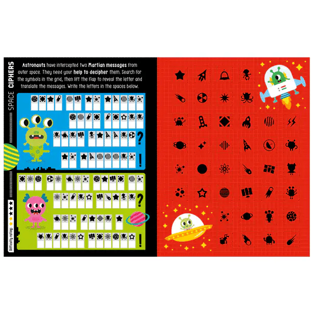 Put your skills to the test with this brain-buster lift-and-reveal activity book. Become a puzzle pro as you conquer quests and crack codes, plus have fun with creative card press-outs!