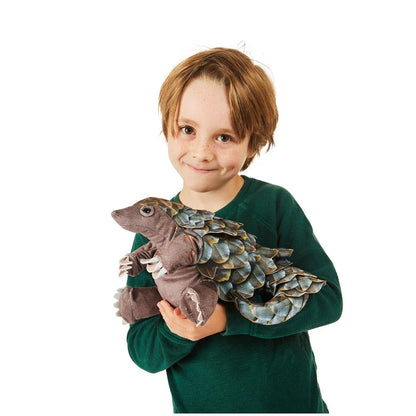 The fascinating Pangolin is an extraordinary scaly skinned mammal that resembles a reptile. Distinctive illusion printed scales, movable head and forelegs with a tail that wraps around gives life to this marvelous Folkmanis Puppet.