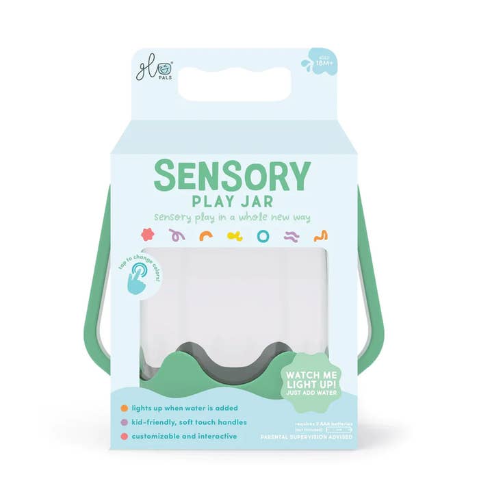 Pack some fun and adventure into your next outing with a Sensory Play Jar! Tap to change colors The Sensory Play Jar is perfect for playtime on the go with its locking, spill-proof lid. With 4 vibrant colors to choose from, you'll be ready for endless sensory fun! (Don't forget the 3 AAA batteries - they're not included.)