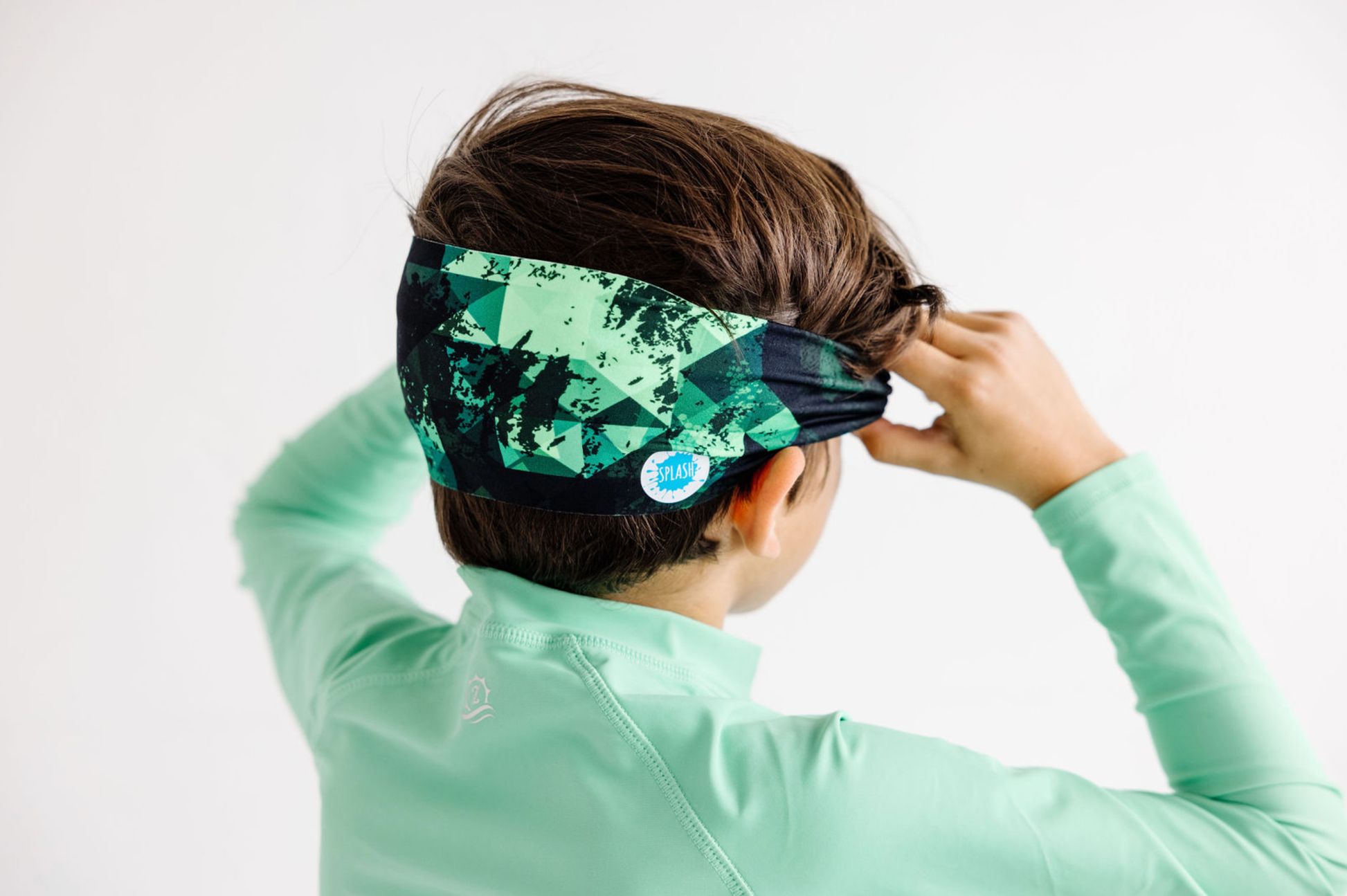 Our Green Fusion swim goggles feature our tangle-free strap in solid black on a black frame with lightly tinted blue lenses.
