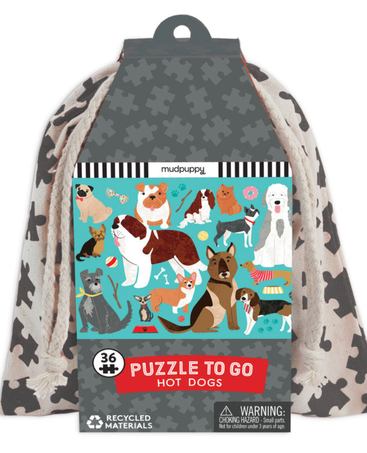 Mudpuppy's Hot Dogs Puzzle to Go features the adorable illustrations of favorite dog breeds. Packaged in a travel-friendly drawstring bag, puzzling on the go has never been so easy! The finished puzzle fits on an airline or train tray table.