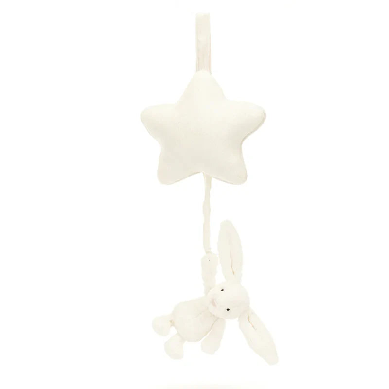 Bashful Cream Bunny Musical Pull is sure to send little ones to a joyful dreamland. Tiny Bashful Cream Bunny hangs from a soft cream star with contrast piping, all created from recycled fibres, and can be pulled down to play the sweet original Jellycat Lullaby.