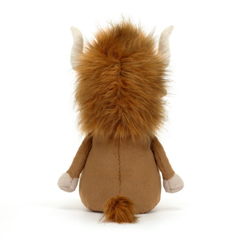 Ramone Bull has a wild mane of silky fur in ginger and charcoal. This sturdy bull has beige suedette horns, a cinnamon tum and a tassel tail. Ramone's got a huge stitched nougat nose and matching cloven hooves.