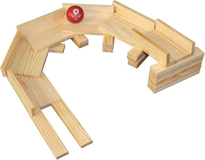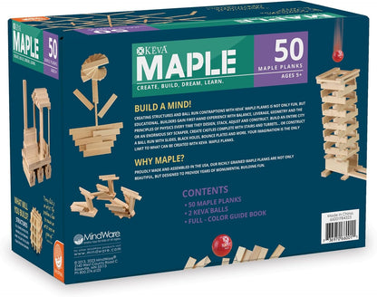 Set includes 50 maple wood planks, 2 KEVA balls, and a guide book.
