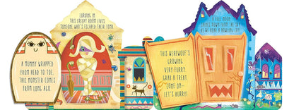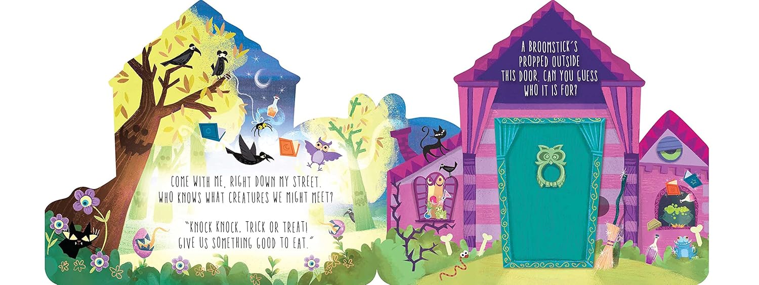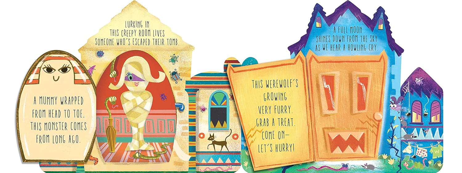 Knock, knock, trick or treat! Knock on the doors and lift the flaps to see who’s hiding inside this spooky haunted house!