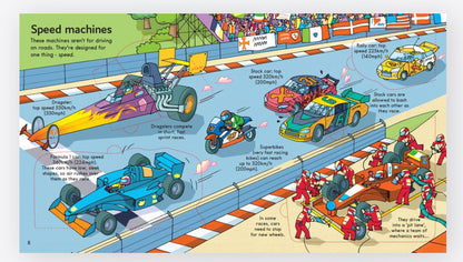 Lift the flaps to explore all sorts of exciting vehicles - bulldozers rumbling around building sites, fire engines rushing to emergencies, and jumbo jets soaring into the skies. With fascinating facts about every vehicle, from speed machines to giant trucks, emergency vehicles, tractors, and planes all geared to delight inquiring minds. The colorful scenes are covered with flaps, each packed with even more detail to entertain young readers.