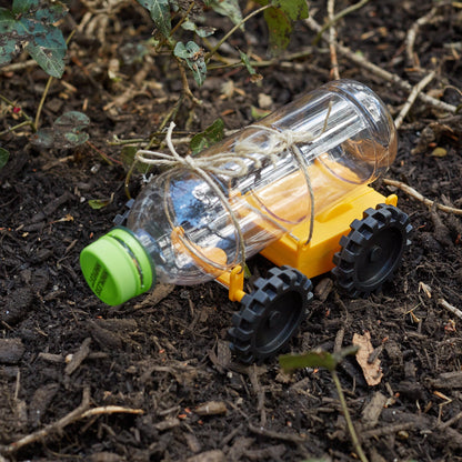 Construct your own car by affixing a bottle, piece of wood, or anything else you might be able to find to the base of the car with a piece of string. Switch your vehicle on and watch to see how far it can go! Includes: 2 car parts, 2 pieces of string, and 2 AAA batteries.
