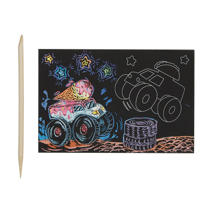 Scratch and scribble and let these monster trucks vroom on in! This scratch art kit includes 4 adorable big-wheeled trucks that rev to life when you scratch the design with the wooden stylus. Two blank scratch sheets are also included in this scratch art set, allowing your little one to create their very own four-wheeler.