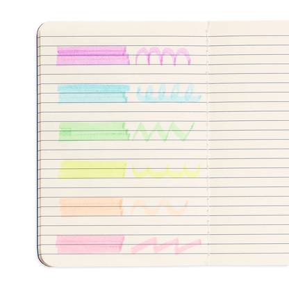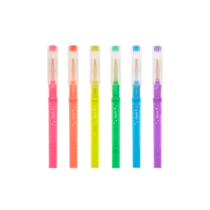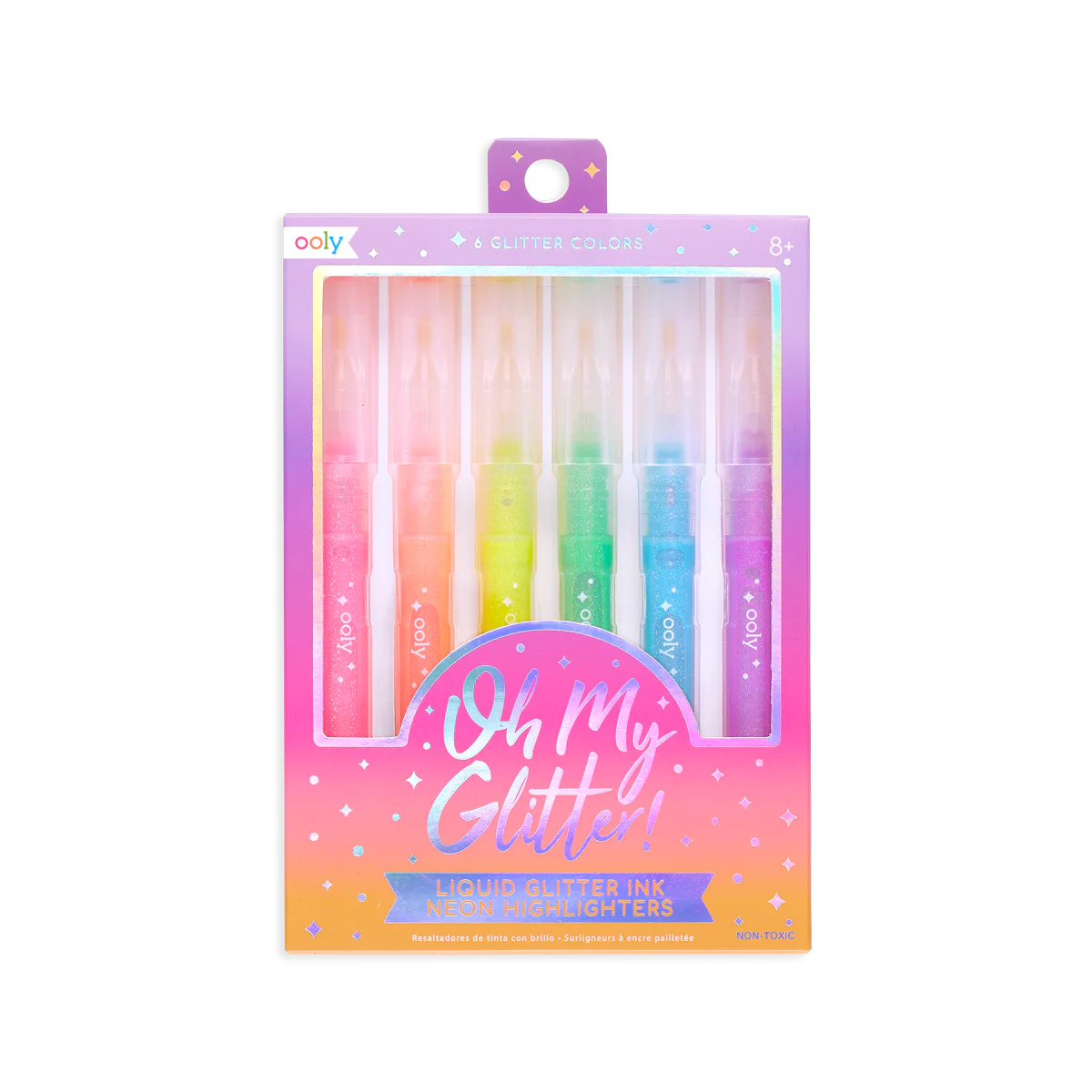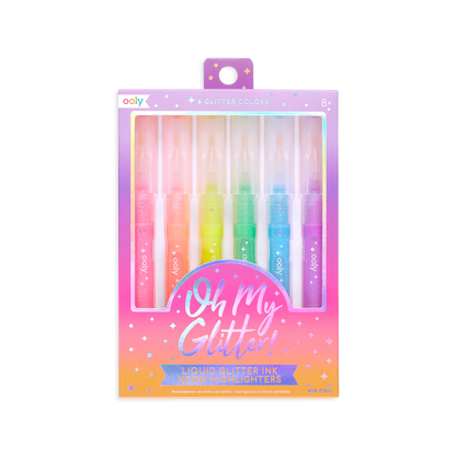Glitter and more glitter is what you get with the Oh My Glitter! Liquid Ink Highlighters! This set of 6 sumptuous neon colors of liquid highlighter have sparkly inks featuring chisel tips for versatility. These glitter highlighters are sure to attract attention! These liquid highlighters have beautiful glittery ink that is acid free with a chisel tip for easy marking. Oh My Glitter! Liquid Ink Highlighters are even encased in iridescent glitter barrels just adding to the overall gleaming effect. With the 6 neon highlighter colors, just imagine how you will decorate your planner, calendar or journal. Make everyday extra special with some glittery fun!