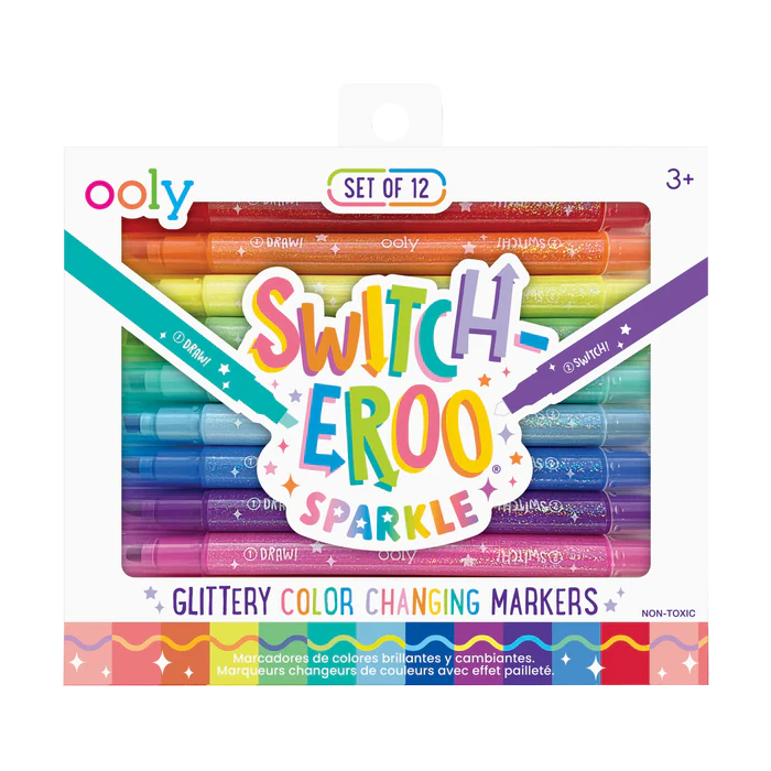 Add some sparkle to your creations with the Switch-Eroo Sparkle Glittery Colour Changing Markers! This set of 12 color changing markers combines vibrant glittery hues with an exciting surprise—each marker is double-ended, featuring a dazzling glittery color on one side and a surprise mystery color on the other. Use the glitter side to add shimmer and shine, then flip the marker to reveal a secret shade to totally switch up the shade and switch up your design. These glitter markers are ready for all your creative endeavors - decorating cards, personalizing notebooks, or making school projects stand out.