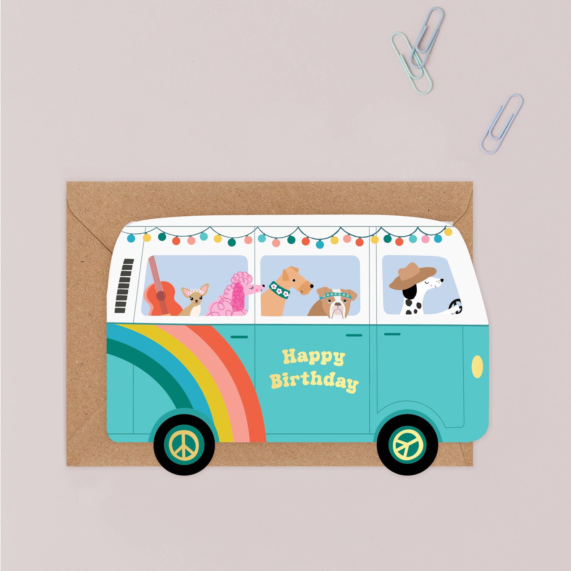 Bring smiles and tail wags with this fun and playful camper van-shaped greeting card featuring a trio of adorable hippie dogs! Onboard the bus are a chill Bulldog, a flower-crowned Chihuahua, and a Dalmatian rocking a laid-back hippie hat—ready to roll and spread good vibes. Perfect for birthdays this card stands out with its creative shape and colourful, lighthearted design. Made in the UK Scalloped diecut card Gold foil accents Size: 105mm x 150mm Uncoated premium 300gsm, responsibly sourced card Paired with a recycled kraft envelope Blank inside Supplied without cello packaging