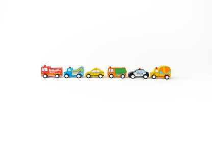 Our Around the Town Cars are Pull Back Racers!These little wooden cars has everything you need to keep your town going. Pull them back, then let go for a burst of speed. Includes fire engine, police car, taxi, tow truck, and sanitation truck.