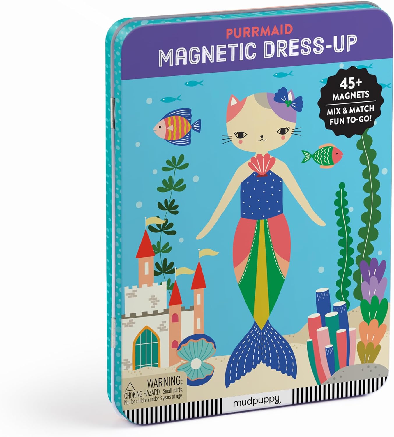 Mudpuppy's Purrmaid Magnetic Dress-up includes 2 illustrated scenes and 3 sheets of mix and match magnets for dressing up these adorable cat-mermaids. The sturdy tin package offers hours of imaginative play with easy cleanup and storage of pieces. Mudpuppy's Magnetic Tins are the perfect children's travel toy and quiet time activity.