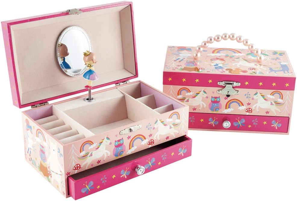 Our musical jewelry boxes are one of our best selling products! With a pretty pearl handle and a drawer for extra storage space making this box a guaranteed best seller. Wind up the key at the back, open the lid and the fairy twirls to the beautiful music "over the rainbow".