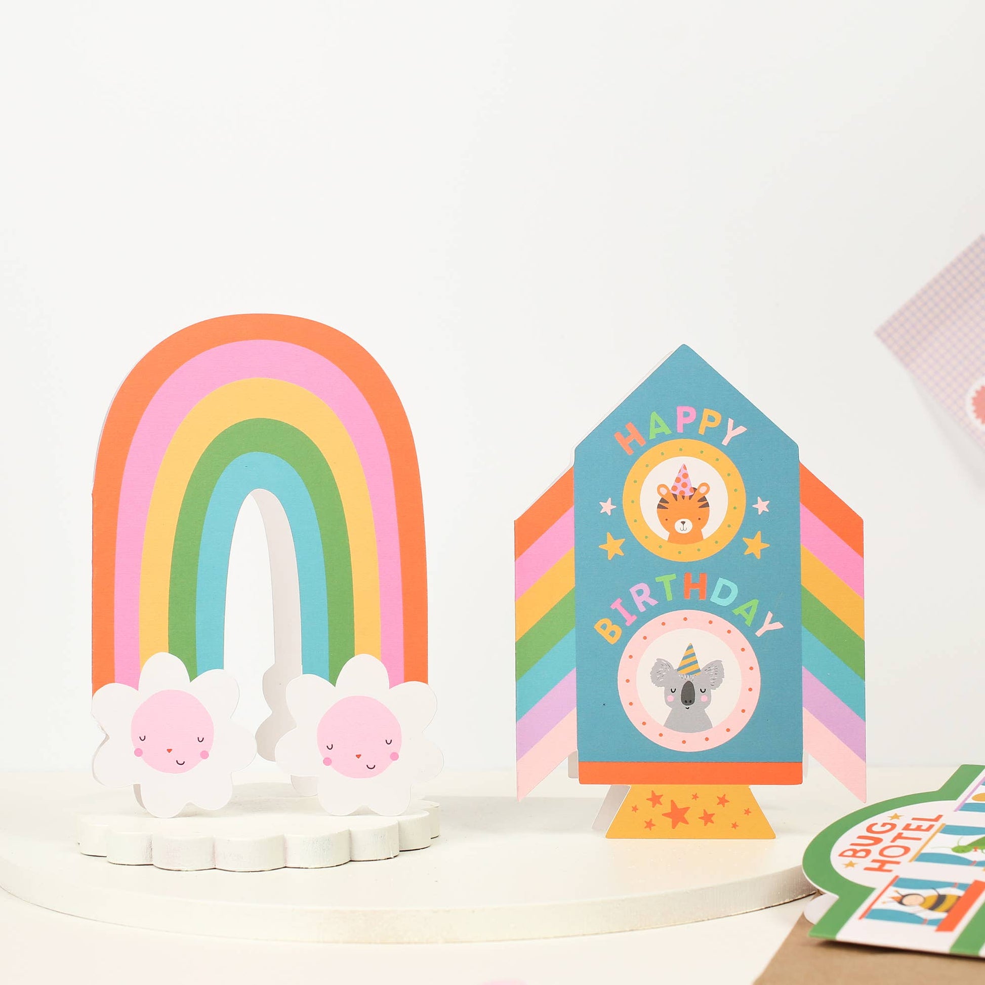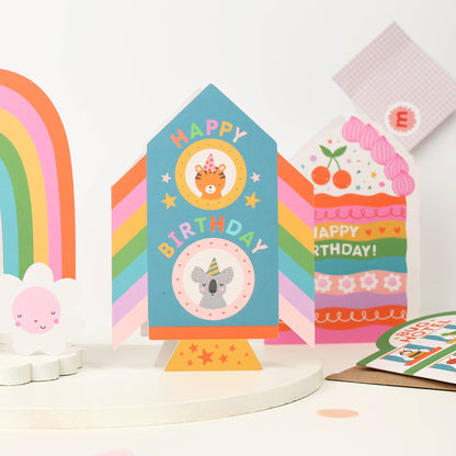 A lovely illustrated children’s birthday card, die cut into the shape of a rocket. Featuring a sweet koala and a tiger, blasting off in a bright rainbow rocket, this fun and playful kid’s card is perfect to celebrate your loved ones birthday. This luxury card was designed and made in the UK. Made in the UK Size: 105mm x 150mm Uncoated premium, responsibly sourced card Paired with a kraft envelope Blank inside Supplied without cello packaging This is just one of many designs from the Mifkins Playtime collection.