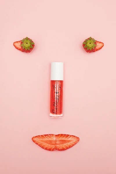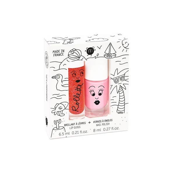 Duo set containing a cookie pink nail polish and a strawberry rollerball lip gloss. 100% kids, 100% fun.