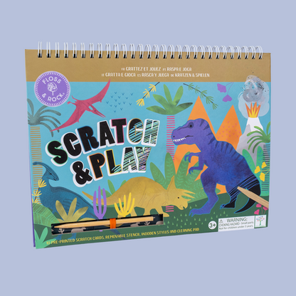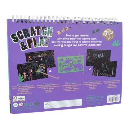 Scratch away and play! Hours of creative fun can be had with our Scratch & Play spiral bound books. Inside you'll find 10 pre-printed scratch cards containing our fabulous Dinosaur illustrations - dinosaurs, cave people, volcanoes and more. Using the wooden stylus included you can scratch to 'colour in', create new lines or coloured shapes. The stencil card included can be taken out and placed anywhere in the book, meaning you can follow the guidelines to scratch a stegosaurus, diplodocus, pterodactyl and more!