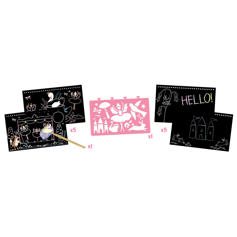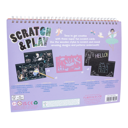 Scratch away and play! Hours of creative fun can be had with our Scratch & Play spiral bound books. Inside you'll find 10 pre-printed scratch cards containing our fabulous Enchanted illustrations - ballet dancers, cute woodland creature friends, tea cups and more. Using the wooden stylus included you can scratch to 'colour in', create new lines or coloured shapes. The stencil card included can be taken out and placed anywhere in the book, meaning you can follow the guidelines to scratch ballerina, bird, swan shapes and more!