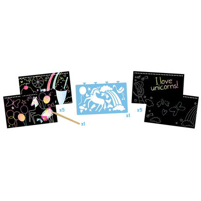 Scratch away and play! Hours of creative fun can be had with our Scratch & Play spiral bound books. Inside you'll find 10 pre-printed scratch cards containing our fabulous Fantasy illustrations - mermaids, butterflies, unicorns, rainbows and more. Using the wooden stylus included you can scratch to 'colour in', create new lines or coloured shapes. The stencil card included can be taken out and placed anywhere in the book, meaning you can follow the guidelines to scratch unicorn, rainbow, flamingo shapes and more!