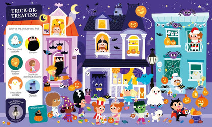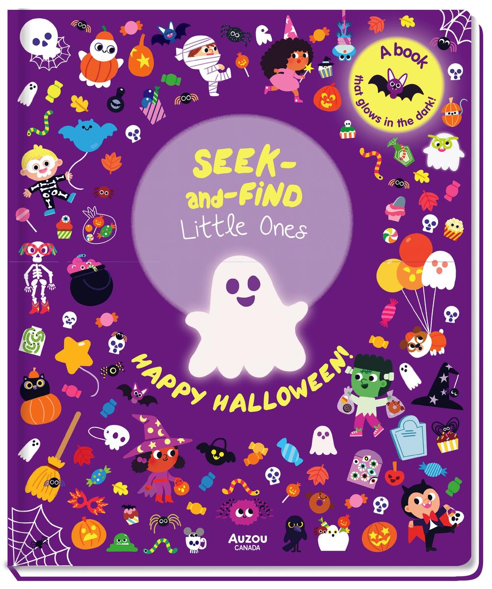 Get ready for a spooky Halloween by searching through 9 colourful scenes for 7 hidden items and a bonus to find on each spread, with glow-in-the-dark elements throughout! This beautiful, high-quality board book makes the perfect gift for toddlers. With sweet illustrations and entertaining settings, little ones will go on a magical journey and imagine their own creative stories as they search for the hidden characters and objects. Perfect for keeping little ones busy before they can head out trick-or-treating! Scenes: Jack-O’-Lanterns, At the Farm, Halloween Costumes, the Market, the Haunted House, the Corn Maze, the Candy store, Daycare, Trick-or-Treating