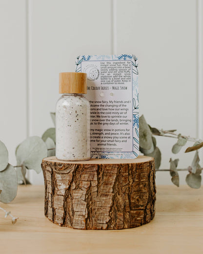 I am the Snow Fairy. My friends and I welcome the changing of the seasons and love how our wings sparkle in the cold misty air of winter. We love to sprinkle our magic snow over the lands, bringing magic to the grey days of winter.