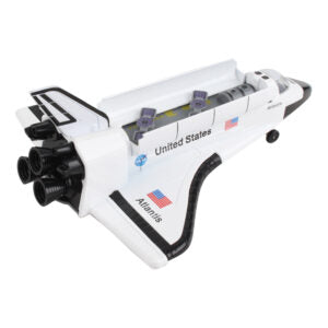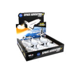 Pull back diecast space shuttle with opening bay doors with spinning satellites.