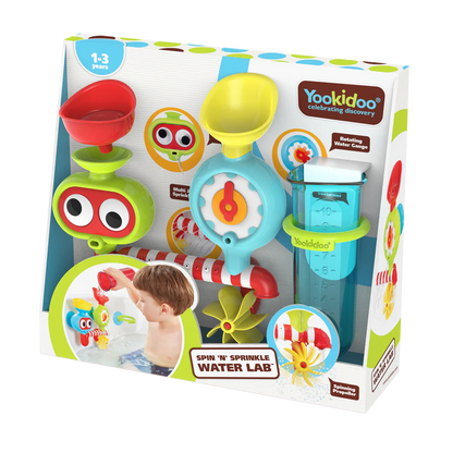 - 1 x googly-eyed activity center with multi-jet sprinkler, spinning propeller, detachable funnel, rotating water gauge