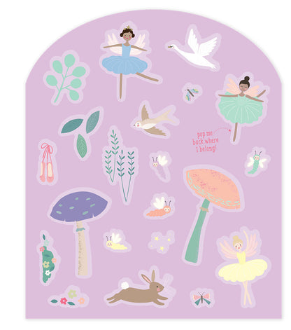 Enchanted Stick & Play book is so much fun, and educational at the same time. With over 50 fun shaped reusable stickers including Ballerina's, a smiley moon, birds, rabbits and so much more. There are 2 fold out scenes to create and make up stories using the repositionable stickers. At the back there is a seperate section where you match the stickers to their shapes. This will entertain little ones for hours! The hard back book folds completely flat making it perfect for travel and taking out and about.