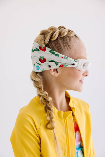 Our Strawberry Fields swim goggle features our tangle-free strap in a Strawberry and ladybug print on a light green and white background. Paired with a white frame and clear lenses.